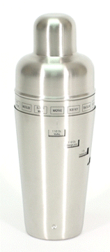 32 Ounce Recipe Style Martini Shaker is made of durable 18/10 brushed stainless steel to withstand daily abuse and frequent washings. The cocktail shaker also features a three piece design that includes a bottom cup, an intermediate strainer and a top cap shot cup. The shaker has a unique dial-a-drink feature that will make a master mixologist out of even the most inexperienced wannabe. Drink recipes include of course a Martini, Whiskey Sour, White Russian, Mudslide, Bloody Mary, Madras, Rob Roy, Tom Collins, Rusty Nail, Gimlet, Manhattan, Cosmopolitan, Maitai, Margarita, and Vodka Martini. This martini shaker is very cool, a great conversation piece, and a must have for any bar.